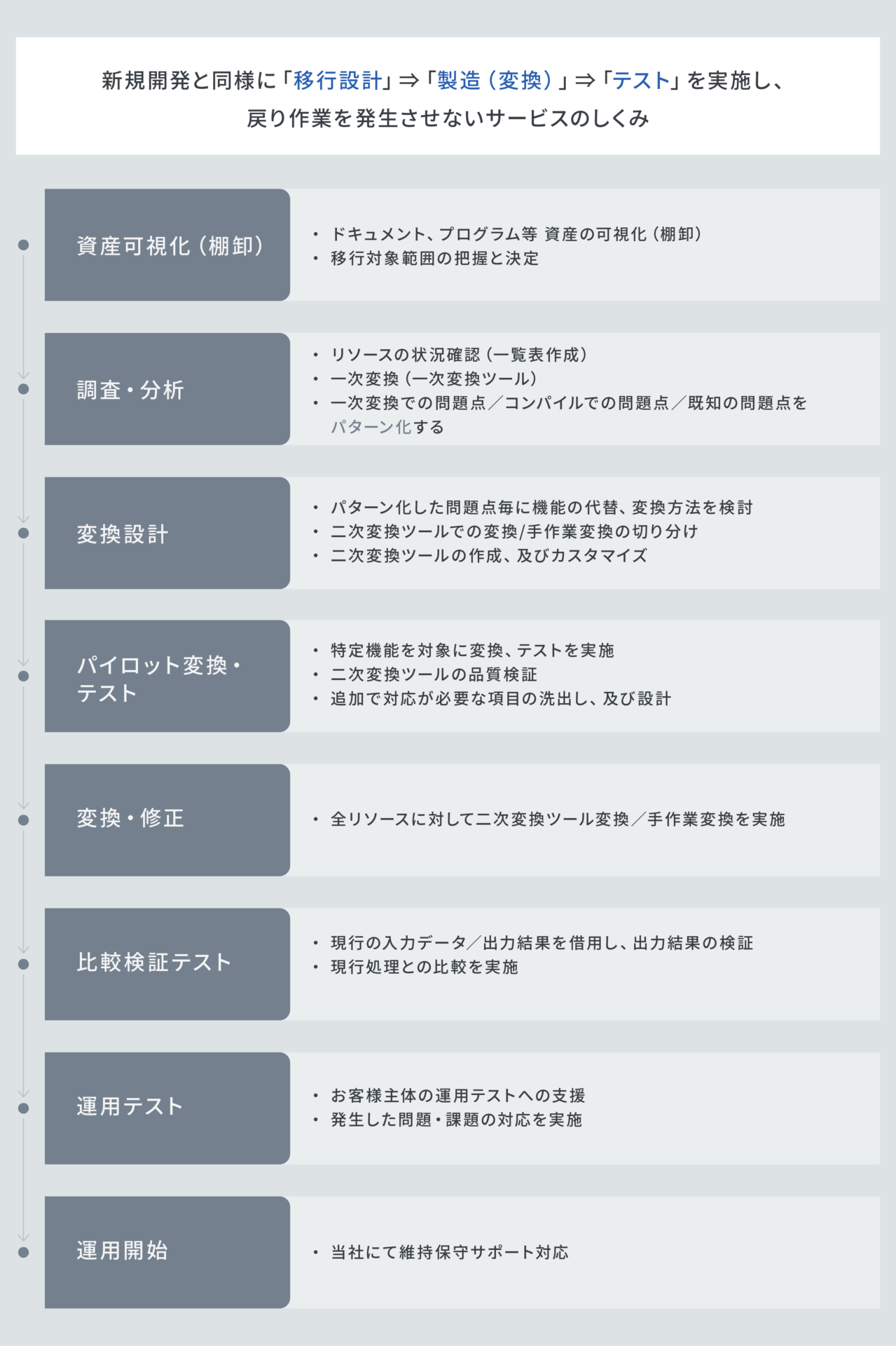 その後、各パターンごとに機能の代替や変換方法を検討し、カスタマイズした二次変換ツールによる変換を実施します。一次/二次ツールでは全体資産の約90%を自動変換し、残りを手作業で最適化および変換します。