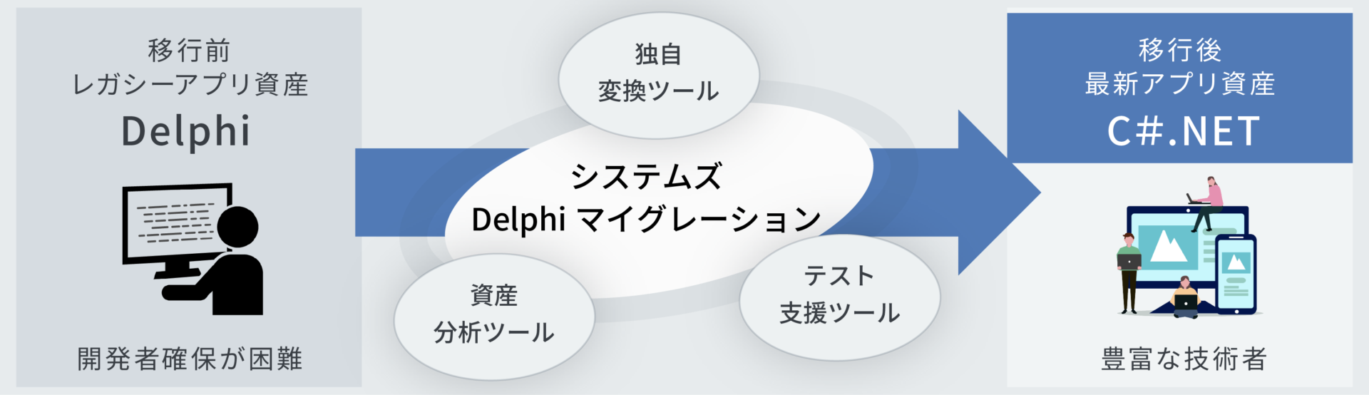 システムズの「Delphiマイグレーション」は、こういった課題を解決するため、既存のDelphi資産を活かしながら、C# .NET環境への移行を支援します。
