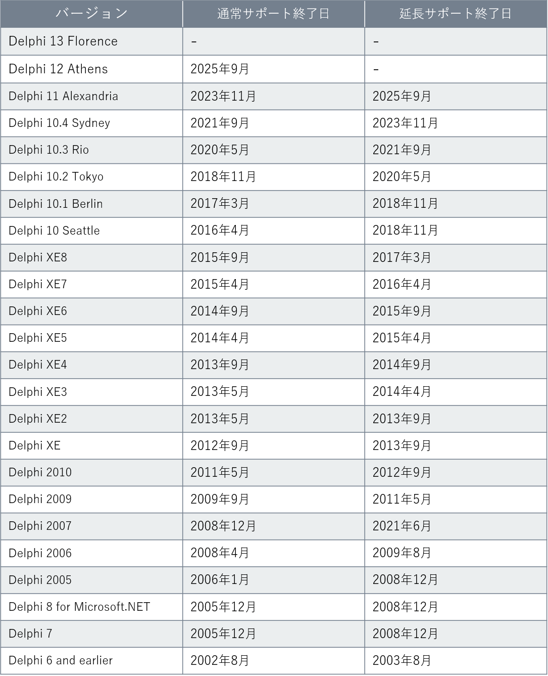 さらに、Delphi 5/6/7をはじめとした旧バージョンは、すでにベンダーサポートが終了しており、脆弱性対応や不具合修正が提供されない状態となっています。(以下「Delphiサポート期限一覧」参照)